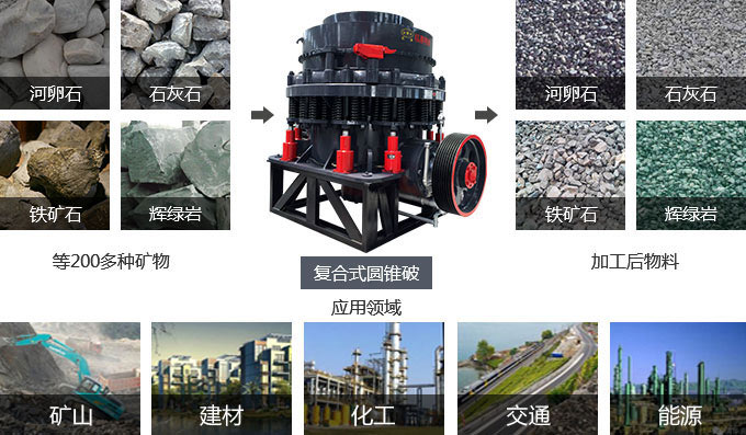 復(fù)合型圓錐破碎機(jī)廣泛應(yīng)用在礦山、冶金、建材、筑路、化學(xué)與硅酸鹽等行業(yè)中,適用于中等和中等以上硬度的各種礦石和巖石破碎作業(yè)。可破碎鐵礦石、銅礦石、石灰石、花崗巖、玄武巖、頁(yè)巖、石英石、河卵石等。
