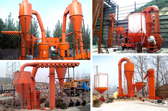 大塊物料經破碎后由提升機送入儲料倉,再由電磁振動給料機均勻地送入主機研磨室,進入磨室的物料被鏟刀鏟起,進入磨輥與環之間被碾壓搓碎,風機將風吹入磨室內,吹起粉末帶入分析機內,進行分選,達不到細度的又落研磨室重磨,合格細粉則隨氣流進入成品旋風集粉器,細粉與空氣分離后從卸料口排出即為成品,而空氣從上端回風管返回風機內,風路是循環的,并且是在負壓狀態下流動。